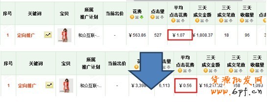 如下面是女裝定向的2款寶貝的出價和點擊情況。