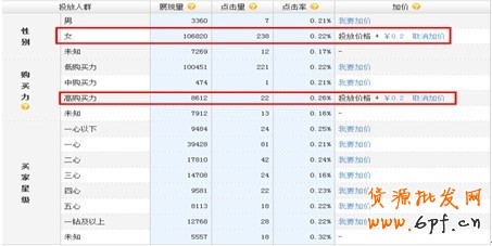 鎖定一個群體,針對性的選款。一個白領,22-27歲左右,月收入4000以上,她們的消費習慣,這些人不會去買20幾塊的連衣裙,幾塊錢的短袖。把人群定位好了,再分析寶貝人群性別定位,對主要購買人群進行加價。通投位置出價可以比較低,加大對性別的出價。分析寶貝價格定位,選擇合適的購買力進行加價。