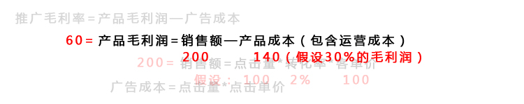親!相信任何老板叫你來開車都不會不計(jì)成本吧!不賺錢可以,但至少不能巨虧吧!假設(shè)我們不能虧錢,我們的推廣毛利潤就必須大于0,由此可以推算出我們的廣告成本是絕對不能大于60的,否則就得穿褲衩去游街啦!