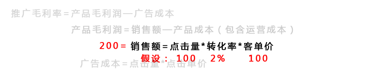 假如我們的直通車被點(diǎn)擊了100次,成交轉(zhuǎn)化率為2%,客單價(jià)是100,那么我們這次通過直通車獲益的銷售額就是200.