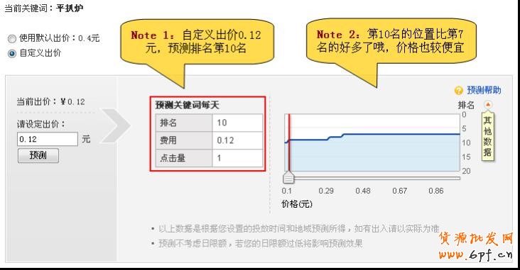 6、在右側展示位靠下方的 當合理出價的排名只能在7、8名,進入排名前5需要出較高價格時,我們沒有必要去拼,我 們可以把展示位適當調到下方或者第二頁,這些或許也會是不錯的位置哦。 例如同樣是“平扒爐”這個關鍵詞,默認出價是0.4元,排名是第7名;而我們自定義價 0.12元,排名是第10名,位置更好哦。