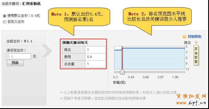 5、該關鍵詞很少人推薦的 有時我們選擇的關鍵詞是比較少商家推薦的,但搜索次數不低的,排名第1與第2的價格會相 差很遠哦,如此我們就沒有必要出價排名第一,出價排名第二同樣可以達到一樣的效果,同 時還能節省不少的推廣費用哦。 例如同樣是“匯利香腸機”這個關鍵詞,默認出價是0.4元,排名是第1名;而我們自定義價 低于0.1元,排名是第2名,效果是一樣的。