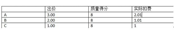 大家看表格1為什么拍第一,A的綜合排名是3*8=24,B的綜合排名是2*8=16,所以A排第一名。哪現(xiàn)在A的價(jià)格=B的出價(jià)XB的質(zhì)量得分/A質(zhì)量得分 + 0.01元,也就是2*8/8+0.01=2.01,接下來我們看下一個表格2