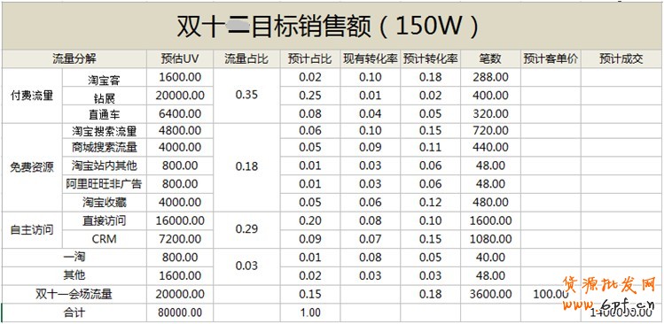 按付費流量、免費資源、自主訪問和會場流量去匯總,分別按不同的轉化率去計算才是正確的。