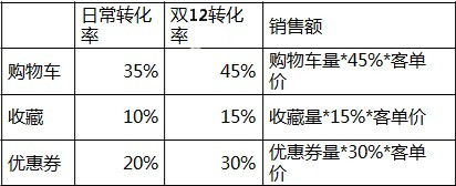 去年(收藏+購物車+優惠券)轉化的銷售額占到雙11總成交的42%,根據日常成交、年中大促或8.28數據,分解購物車、收藏和優惠券需帶來的銷售額,并計算出所需的購物車、收藏量和優惠券量,再分配到重點預熱期中的每一天。