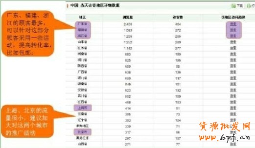 通過分析各區域商品銷售情況,可以計劃不同的推廣策略。比如說顏色深的地域,可以用直通車集中進行推廣劃,讓好的更好。對于顏色淺的這些地帶,要去推敲它為什么會少,如果是地域原本人煙稀少,或者是快遞送不到,這是我們無法解決的。但如果是店鋪內部有問題,我們就要去做調整。比如查看運費是否合理等。在測試階段,可以做一個包郵嘗試,看該地域是不是真的沒有買家,真的沒有流量,通過搞活動看一下可不可以帶來一些流量,讓這些淺顏色的區域流量變大。