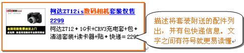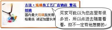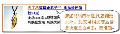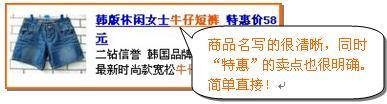您很可能因此就錯(cuò)過(guò)一個(gè)大買家!也可能因此招來(lái)大量無(wú)效點(diǎn)擊,浪費(fèi)錢哦! 所以,好廣告的基本要求,就是—— 讓買家即使是眼睛一掃而過(guò),也能在最短時(shí)間內(nèi)明白:您在賣什么寶貝,商品的賣點(diǎn)是什么! 這樣一來(lái):