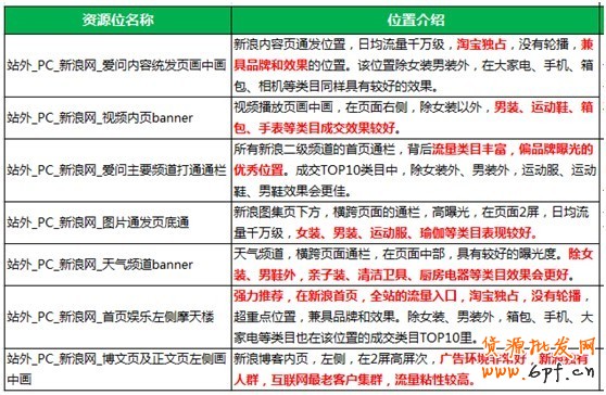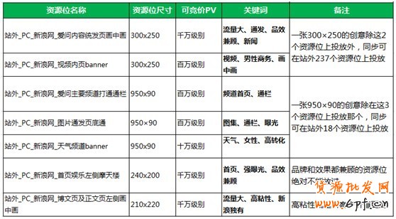 目前鉆石展位在新浪網(wǎng)站下有7個(gè)資源位,分布及特性分析詳情如下: