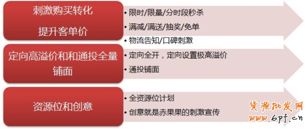 目的:雙11高潮期,通過(guò)前期用戶(hù)的蓄積,當(dāng)天最主要就是刺激購(gòu)買(mǎi)轉(zhuǎn)化,提升客單價(jià),保持全天全時(shí)段流量持續(xù)高漲。定向溢價(jià)出到心里能承受價(jià)格,根據(jù)數(shù)據(jù)反饋及時(shí)調(diào)整。尤其是訪客定向、興趣點(diǎn)定向、DMP定向里的重點(diǎn)預(yù)熱期鉆展觸達(dá)過(guò)的客戶(hù),包括鉆展展現(xiàn)過(guò)、點(diǎn)擊過(guò)的客戶(hù),還有加收藏和購(gòu)物車(chē)客戶(hù),同事大流量資源位上要用通投來(lái)鋪面。如果未參加雙11會(huì)場(chǎng),可提前引爆活動(dòng),用較低的成本獲取流量。