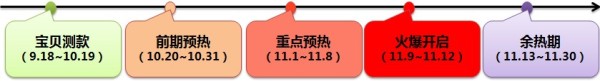 結(jié)合以上2013年大盤(pán)數(shù)據(jù)和2014年?duì)I銷(xiāo)亮點(diǎn),從9月底和11月底近兩個(gè)月的時(shí)間,鉆展雙11營(yíng)銷(xiāo)共分為以下五個(gè)節(jié)奏:
