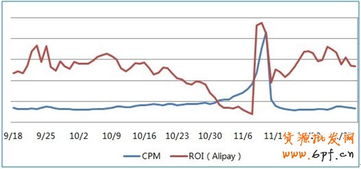 4. ROI(投入產(chǎn)出比)在10月底11月初開(kāi)始下降,在11月9日開(kāi)始大步提升,雙11后回落,經(jīng)過(guò)3天的休整期,余熱期ROI慢慢提升。從這個(gè)數(shù)據(jù)我們可以知道,消費(fèi)者的購(gòu)物熱情從11月9日就開(kāi)始釋放,持續(xù)到11月12日。結(jié)合大盤(pán)數(shù)據(jù)趨勢(shì),我們可以得到更多的投放策略。