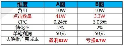 假設投放預算都一樣,是10W,并且完全消耗的情況下(假設而已)根據(jù)圖片的點擊率差異,兩個投放分別獲取到的點擊是41W和3.3W,那么最直接的就是我們看到的CPC的差異。假設轉(zhuǎn)化率和單筆利潤都一樣的情況,他們分別獲得的利潤分別是41W元和3.3W元??鄢ǖ舻?0W廣告費,那么第二家化妝品這次投放是直接賠錢的。這只是一個假設的情況,在實際投放中,加上鉆展的隱形效果,這個差距會后期很明顯