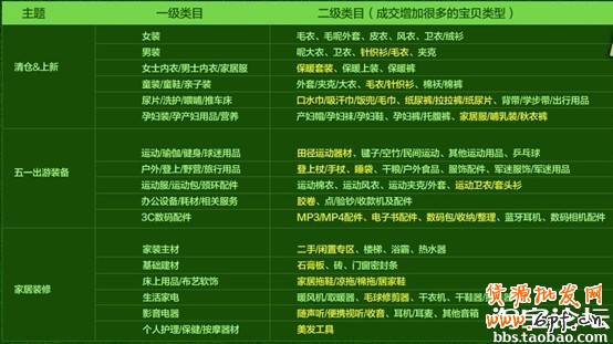 從類目特性來看,五一之前成交增加的行業(yè)主要是服裝、母嬰、運(yùn)動(dòng)戶外、數(shù)碼、家居建材、家電、文化玩樂、虛擬這八大行業(yè)。每個(gè)類目下成交的寶貝類型見下面的表格。