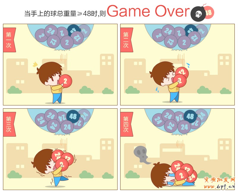 如圖所示,第一次和第二次的球袋里有2、12、24、48的球,前兩次分別拿到了2和12,第三次和第四次的球袋里只有24和48的球,后兩次都拿到了24,所以當總重量2+12+24+24≥48時,GAME OVER。要注意的是,每一次都有機會掉落48的球哦,詳情往上拉查看【觀看須知】中第4點。
