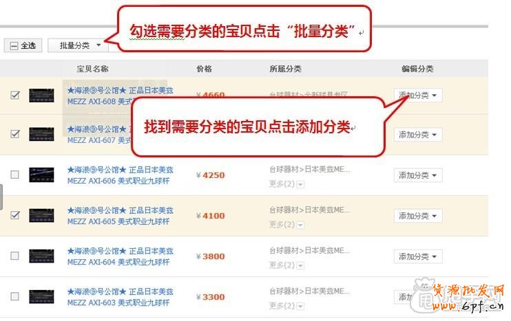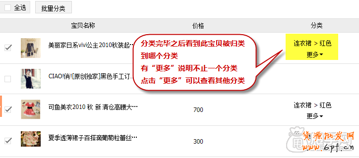 2、可對單個未分類的寶貝添加分類,也可進行“批量分類”的操作,如圖: