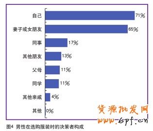 男裝的銷售,有31%是由女性購買的,說明了女性在男裝購買決策中的重要地位。同樣,從男性購買服裝的決策人來看,71%是自己決策,排在第二位的為妻子或女朋友,比例高達65%,說明絕大多數情況,女性都會參與到男裝的購買決策中。在進行產品設計、品牌宣傳和現場銷售時,都需要注意影響陪同購物的女性,品牌男裝不僅要吸引“男人”更要吸引“女人”。(見圖4)