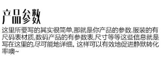 不管什么類目的寶貝,對寶貝詳盡的展示都是必須的,只有寶貝的全面展示,才能更好的讓買家了解寶貝。展示商品全貌:產品正面丶背面清晰圖,根據衣服本身的特點選擇掛拍或平鋪,運用可視化的圖標描述厚薄丶透氣性丶修身性丶衣長丶材質等產品相關信息。