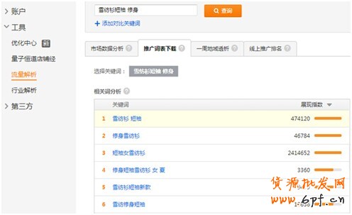 我們進(jìn)入直通車后在左側(cè)的工具里面點(diǎn)擊“流量解析”就能挖到一批相關(guān)關(guān)鍵字,并且還能看到展現(xiàn)指數(shù),指數(shù)低的關(guān)鍵字我們可以忽略不采集。