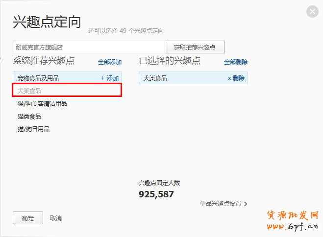 這個可能不是太容易理解,就拿上圖所示的狗糧,如果我定向到貓糧用戶或者所有寵物食品,點擊率肯定會掉下來的,至少很少有一個人同事養狗和貓吧,另外我的素材是狗糧的素材自然要定向給狗糧用戶,不廢話,上圖: