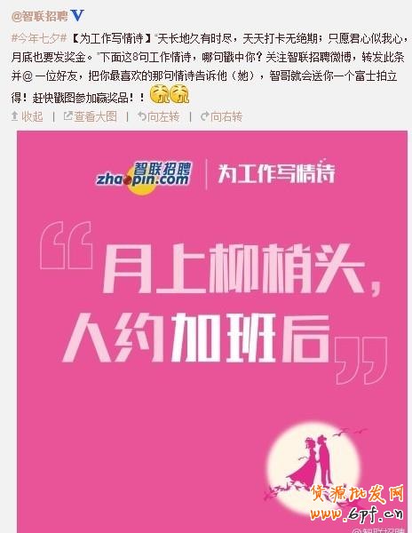 智聯招聘的微博向來是不溫不火,可這次在七夕竟然搶了風頭,為工作寫情詩——“天長地久有時盡,天天打卡無絕期”、“只愿君心似我心,月底也要發獎金”、“月上柳梢頭,人約加班后”……關注,轉發,智哥還送禮品,這點雖然有些老套了,但也為其點個贊。