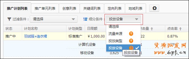 由于移動端直通車展現的位置特殊導致點擊率一般要比PC端高好幾倍,你可以在實時數據查看當天的移動端投放情況,或在下圖位置查看歷史投放數據。不要看到某個計劃的點擊率這么高,怎么質量得分還是起不來,先去看下點擊率是不是靠移動端拉起來的,再看下PC端的實際點擊率。