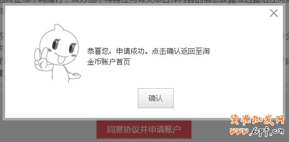 3、查看淘金幣賬戶協(xié)議,點擊【同意協(xié)議并申請賬戶】,提示申請成功,點擊【確認(rèn)】