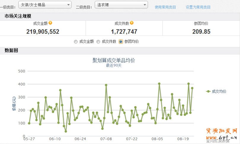 了解主打各葉子類目的曲線圖--結合每月聚劃算類目規劃排期和坑位數量,利用淘指數查看近二年葉子類目趨勢【如下圖葉子類目:連衣裙】,了解商品銷量需求趨勢。為選款做準備。