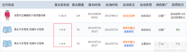 (這個小編是經過考證的,之前小編報名一款牛仔短褲,原價定在是89,實際銷售價格是29.9,第一次報名天天特價定價為19.9沒有通過,后來受邀一個站外秒殺活動一周的時間,價格為16.9,等我回過頭再試著以9.9的價格報名上天天特價,還是沒通過,其實寶貝本身的進價遠就不止9.9元了,卻虧本都沒通過,原因可想而知了,這個問題大家可以分析下,我想大家明白這點,想通過活動就不那么難了)