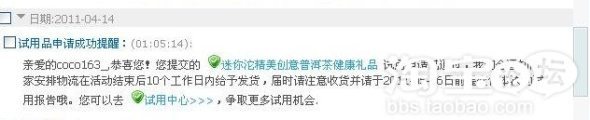 這個茶葉的歡快勁還沒過去,二天之后,我又中到了普洱茶禮。我當時感覺,保持這樣的頻率,儼然一個試用達人了。不過我喜歡。呵呵~