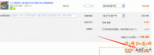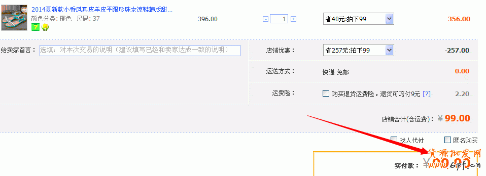 接下來是購買寶貝,頁面價(jià)格截圖如下,實(shí)際付款價(jià)格是99。