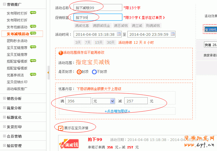 再利用工具做滿減活動(dòng),記住只選擇這個(gè)爆款寶貝參加哦。如下圖,
