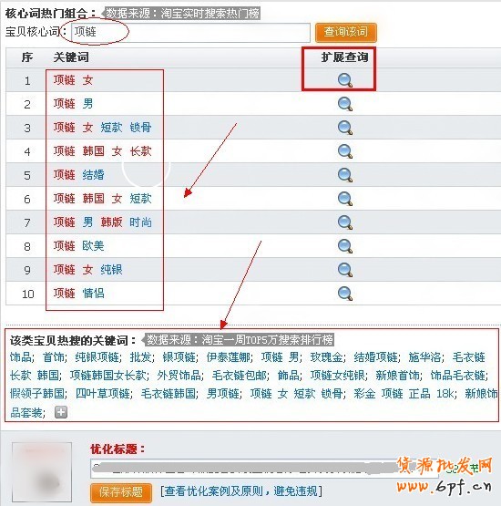 舉例:點(diǎn)擊第一組關(guān)鍵熱詞“項(xiàng)鏈 女”后擴(kuò)展查詢到下面的此表,可以得到細(xì)化一些的關(guān)鍵詞。
