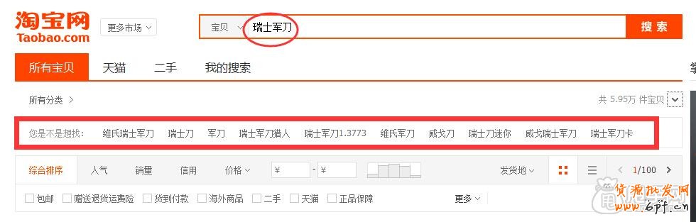 首先我們確定了,“瑞士軍刀”是自己店鋪寶貝的一個熱門關鍵詞,那么就在搜索框內鍵入“瑞士軍刀”進行搜索。大家會在搜索提示框旁邊看到這么一個信息: