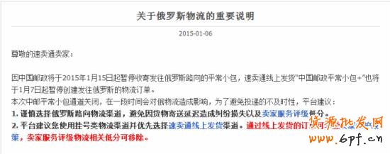 1月6日,速賣通官方針對俄羅斯物流渠道發表重要說明。說明顯示,本次中郵平常小包通道關閉,在一段時間會對俄物流造成影響,為了避免投遞的不及時性,平臺建議如下: