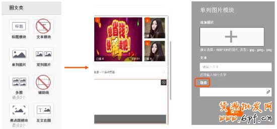 在界面左側(cè)選擇組成模塊類型,中間模擬手機(jī)進(jìn)行實時預(yù)覽,右側(cè)編輯模塊內(nèi)容??偣灿?4個模塊可供選擇,首頁至多可添加12個模塊。