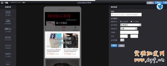 第一項是“寶貝模塊”。寶貝模塊相當于pc端店鋪的“寶貝推薦”模塊。大家可以看到我們可以添加十個這樣的寶貝模塊,而且一個模塊里只能添加6個寶貝,如果10個模塊都用上,就相當于放了60個寶貝在你家手機店鋪首頁上。我們拖動模塊到模擬手機里看一下: