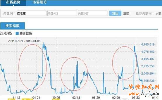 在上面的圖片我們可以看到連衣裙的市場容量占據(jù)了女裝的14%,是女裝的最大市場需求,再結(jié)合我們的需要,在2月份的時候?qū)⒆雎槊尴盗薪K端的連衣裙,接著就分析連衣裙,如何在正確的時間插入市場并且選到我們心中的爆款呢?