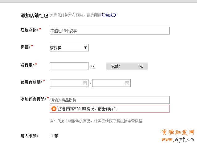 注:3鉆以及3鉆以下信用等級的賣家每次最多可發行1000份,而3鉆以上賣家則可每次設置最多可發行2萬份;50元、100元、200元面值紅包最多不能超過5萬元,否則就會出現警示了。