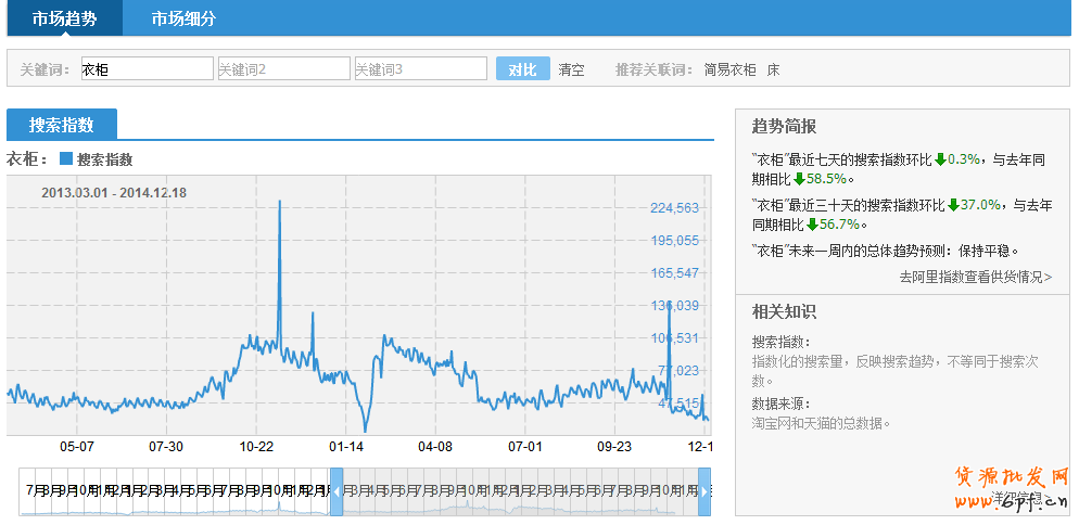 分析查看店鋪30天自然流量占比,來源情況后,我們需要分析導致店鋪流量整體下滑的因素,除了生意參謀系統給出的診斷建議,還需要分析是否因行業流量下滑影響,可以在淘寶指數進行查閱: