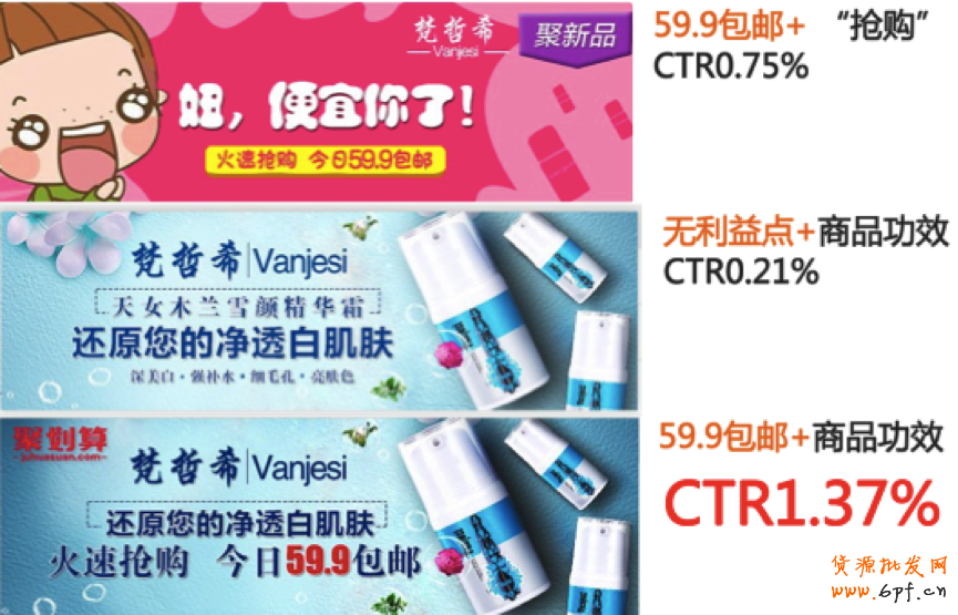 基于品牌的消費者洞察,發(fā)現(xiàn)目標人群是25-35歲的消費層級中等偏好的白領人群,而非可愛的萌妹紙,經(jīng)過調(diào)優(yōu),將粉紅色系的側重搶購的素材調(diào)整為凸顯品質(zhì)感,突出商品功效和利益點的圖片,點擊率提升近80%