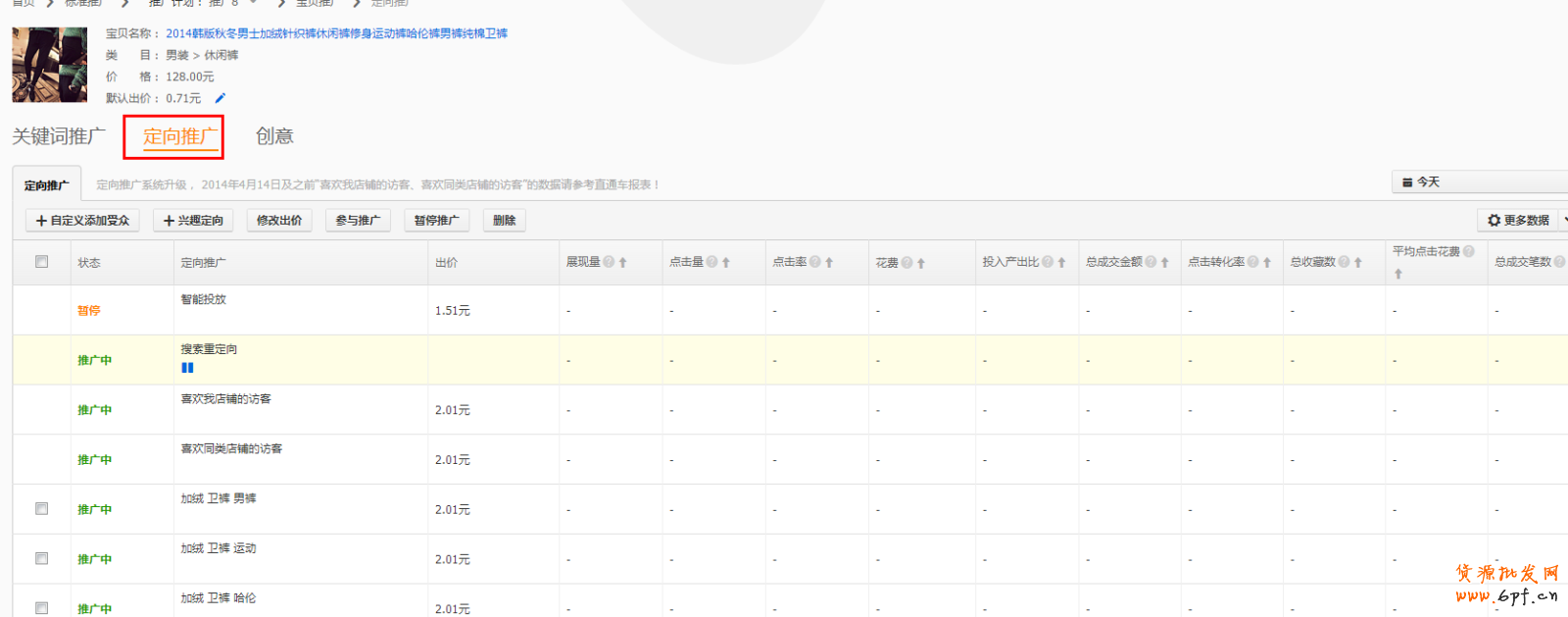 3、查看每個寶貝中,每個關鍵詞、定向和搜索人群的點擊花費情況