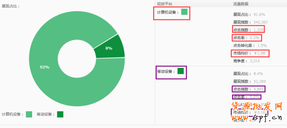 從上圖可以看出,該寶貝最近7天的數(shù)據(jù),移動(dòng)端的點(diǎn)擊率在15%以上,平均點(diǎn)擊費(fèi)用在0.1元,電腦端的在0.76元,便宜了很多倍。