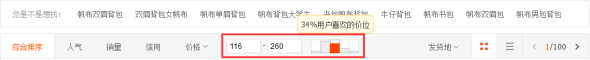 解析:從帆布背包的搜索結(jié)果可以看出,共有4.93萬件寶貝,且從搜索一屏出現(xiàn)的屬性維度看,因?yàn)閷Σ馁|(zhì)的限制,致使整體出來的屬性維度更加接近我們的寶貝,從價(jià)位上看,還是處于第三塊的小方塊內(nèi),價(jià)格相對是中偏高。