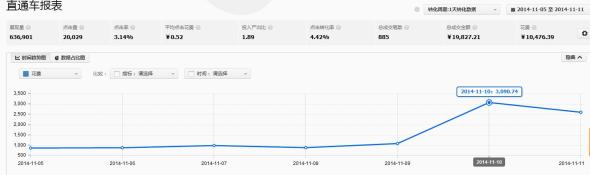 第五周的數據,剛好到雙十一當天,我們可以看到,雙十一當天的成交量自然是最高的,從這個表中我們可能看不出什么,但是從流量和花費的表上,我們卻可以看得出一些問題。
