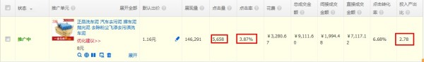 前期的“洗車泥”寶貝上車推廣針對這款寶貝客單價相對較低,前期針對這款寶貝需要先將點擊率和流量培養提升起來,前期這款寶貝的轉化率和投資回報很低,到了后期,就可以針對流量的引進和關鍵詞的收藏轉化數據來進行合理的調整了。