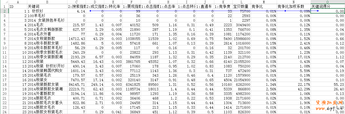 最后算出關鍵詞得分,關鍵詞得分=成交指數*競爭比加權系數(想要流量優選搜索指數,想要訂單優選成交指數)。