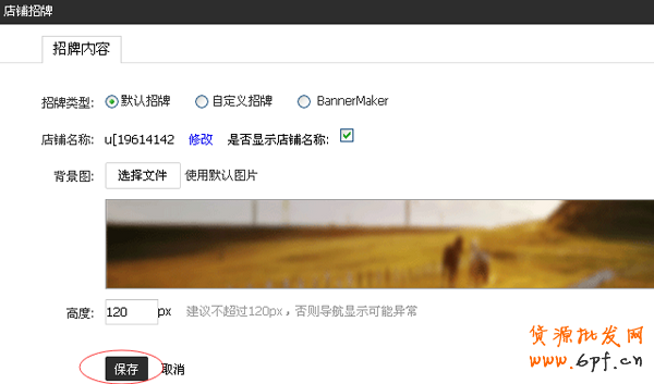 店招可以選擇默認招牌或者自定義招牌,選擇默認招牌的可以自己修改店鋪名稱,選擇背景圖上傳,而自定義招牌則是自己設計店招,上傳圖片到圖片空間,選擇插入圖片或者代碼都可以,接著點擊保存店招就弄好了(如下圖)