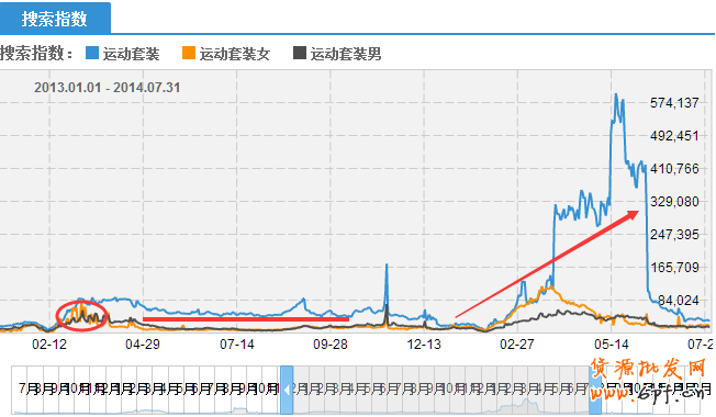 4.從2013年起相對比于2014年上半年,整個運動套裝搜索指數(shù)曲線市場有了大幅度的上升趨勢。同樣整個市場3月份的小高峰也清晰可見,可見運動套裝在3月后的整個市場前景是非常可觀的。