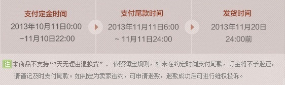 在寶貝詳情的介紹裝修中,放入訂金階段時間和尾款階段時間的說明,樣例: