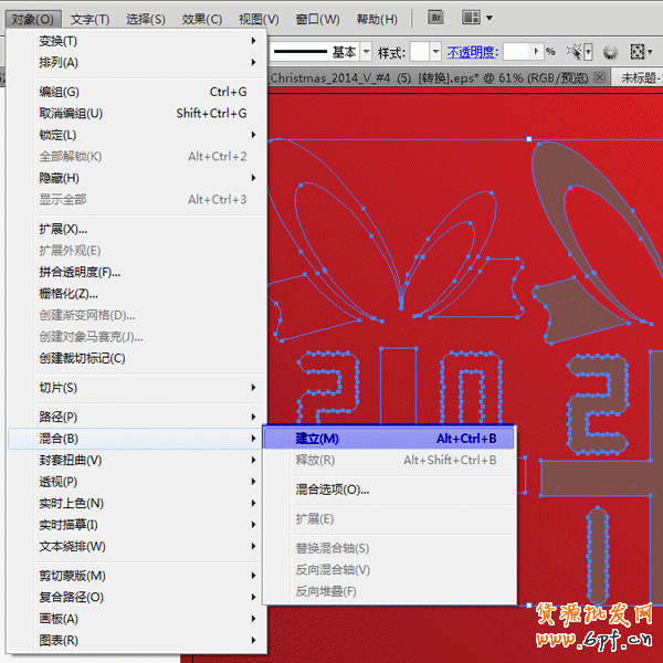 7、同時選擇剛才調節透明度的兩個圖層,點擊菜單中的“對象--混合--建立”。